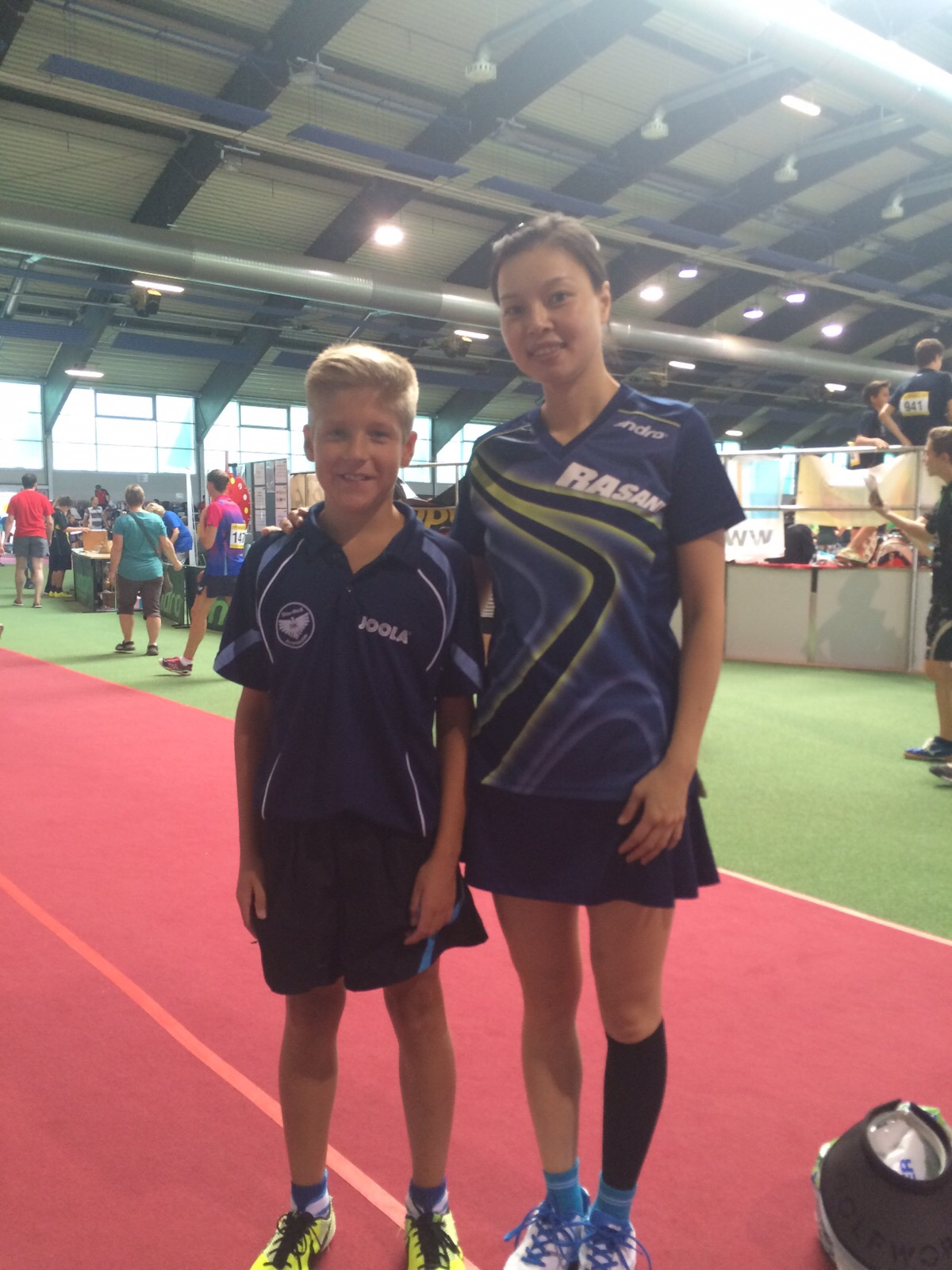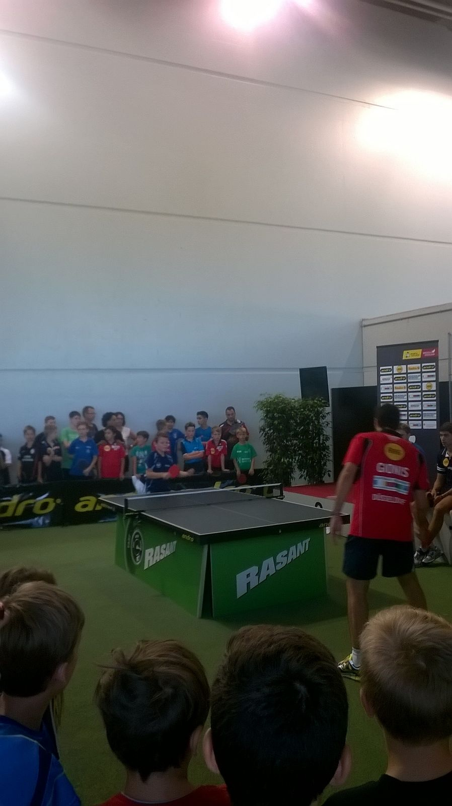 Außerdem konnten die Kinder zwischendurch auch mal mit den Profis in die Box gehen. Wu Jiaduo stand den Nachwuchsspielern lange Zeit für Rundlauf und ähnliche Spielereien zur Verfügung. Auch die Düsseldorfer-Spieler Gionis, Franziska und Boll waren natürlich anwesend und so konnte Jarno auch ein paar Bälle mit dem Abwehrer Gionis spielen.